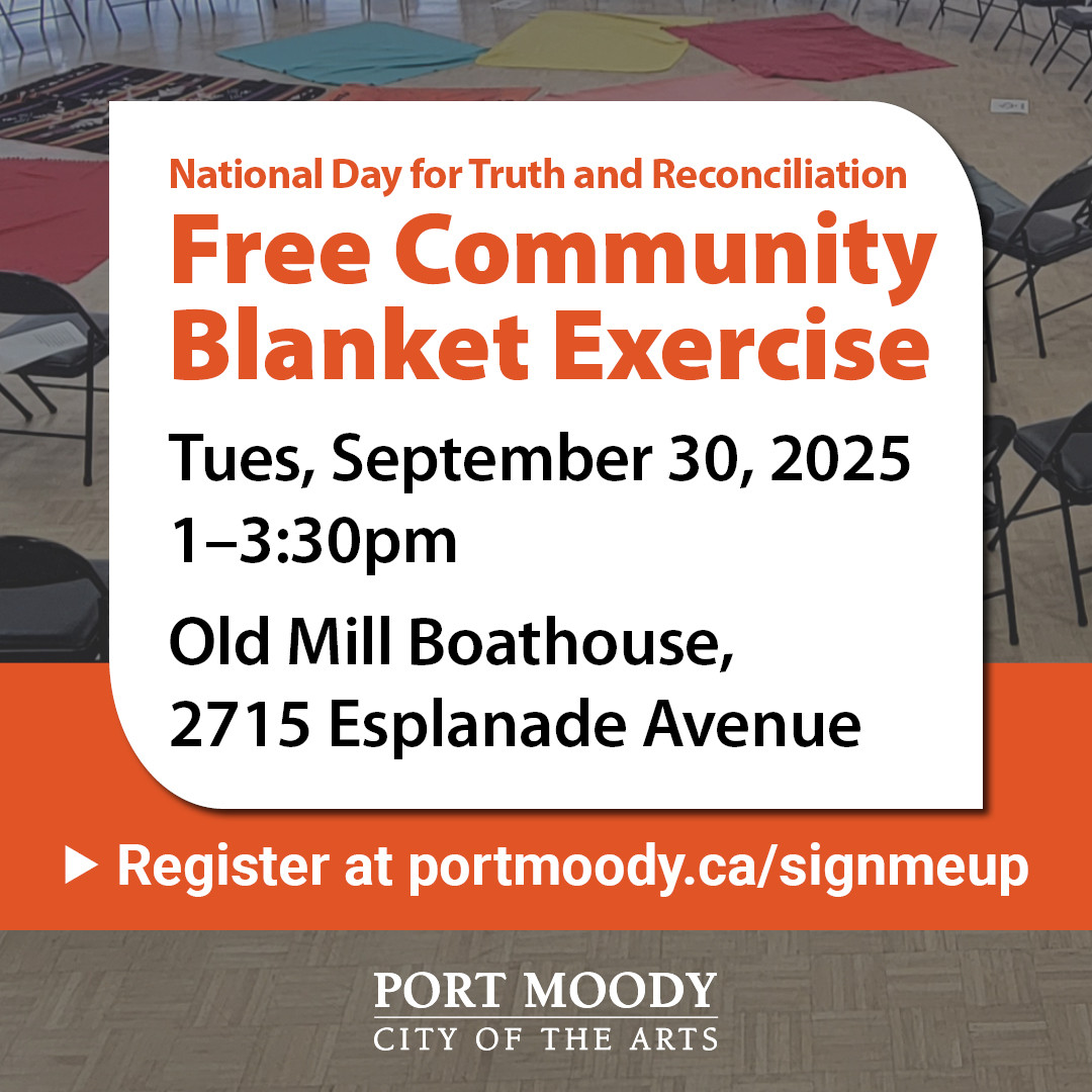 Later that day, join the Blanket Exercise to experience history from an Indigenous perspective, hosted by the City of Port Moody. During this workshop, participants will step on blankets representing the land and into the role of First Nations, Inuit, and Métis peoples. You will be guided by trained facilitators, including Indigenous Elders and Knowledge Keepers such as Sam George from Tsleil-Waututh Nation.